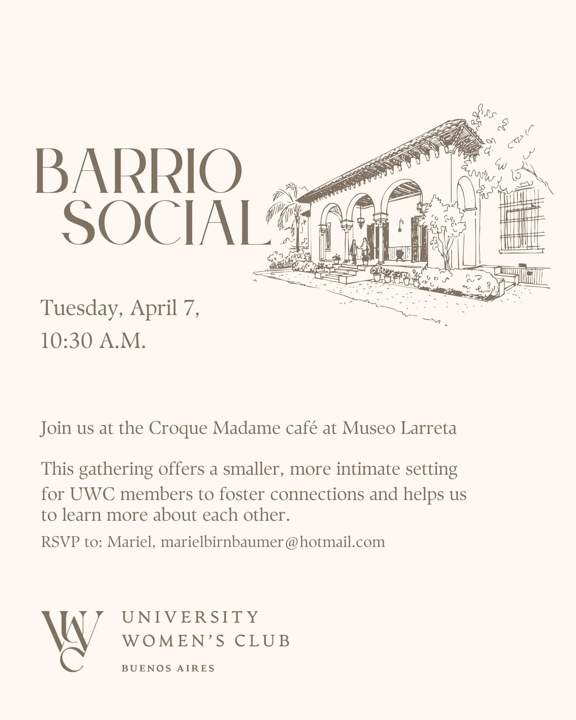 You are invited to gather for a Barrio Social on Tuesday, April 7, 2026 at 10:30 AM. Let Mariel know if you plan to attend so she can help you join fellow UWC Members. Please email her at marielbirnbaumer@hotmail.com