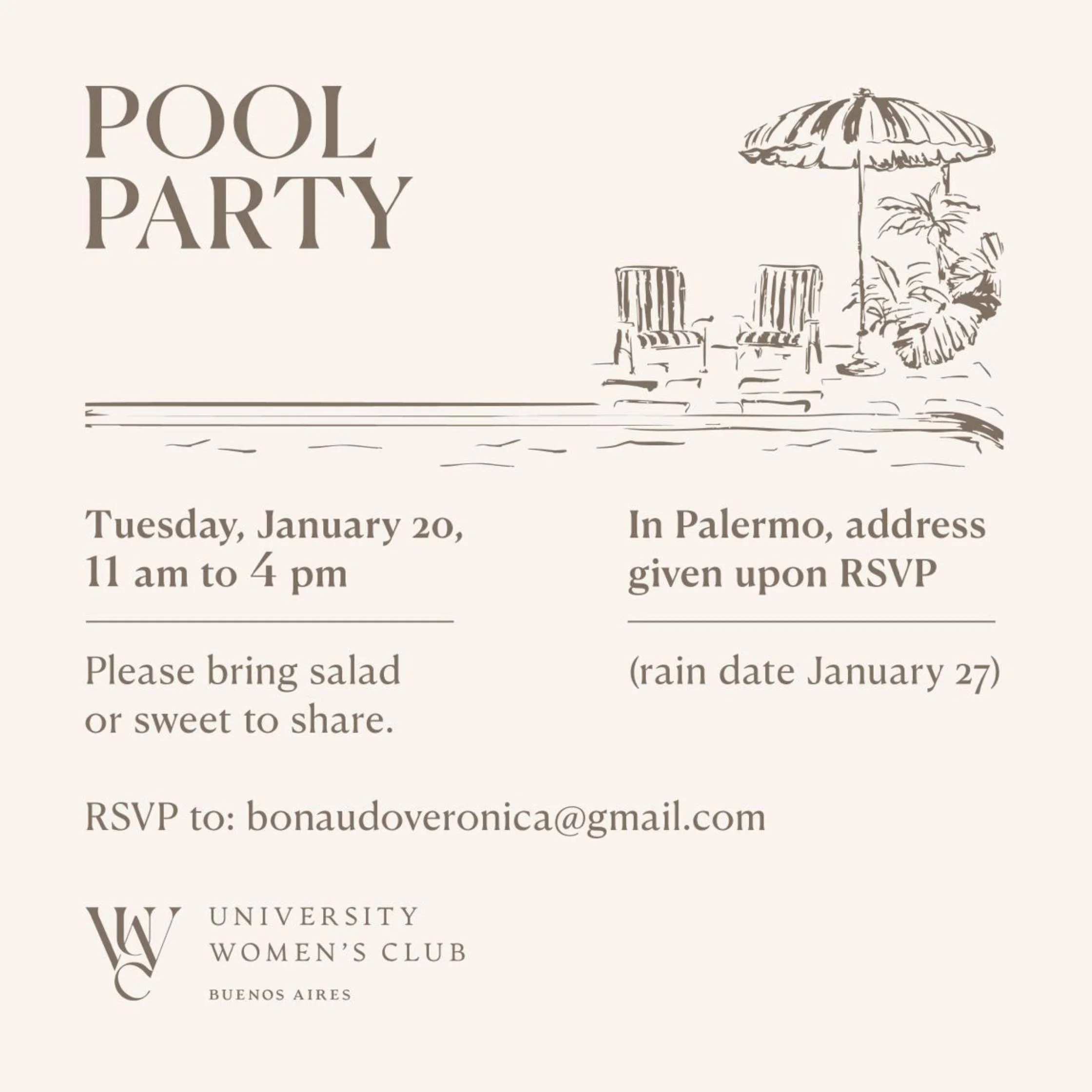 Join us early (at 11:00am), while the sun is still shining on the pool. The location is in Palermo. With your RSVP to Veronica Bonaudo, let her know whether you will be bringing a salad or sweet to share with at least 6 people (or champagne).